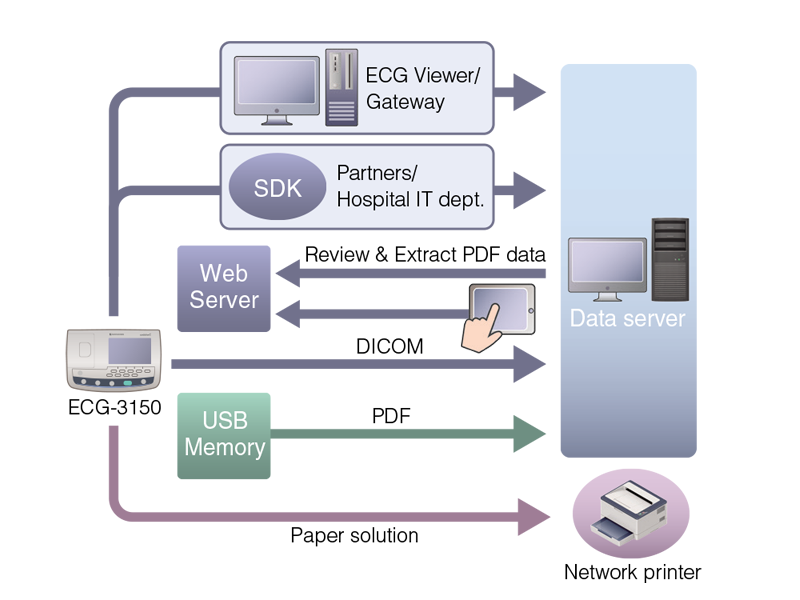 - Ở thế hệ thứ 3, máy điện tim 3 kênh giờ đây đã được nâng cấp lên màn hình màu LCD 5 inches, với khả năng hỗ trợ kết nối tối đa : PACS, HIS, DICOM printer, Pdf output,...
